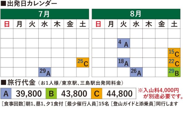 - 入山料として別途4,000円が必要です。(旅行代金には含まれません)。当日添乗員が集金させていただきます。