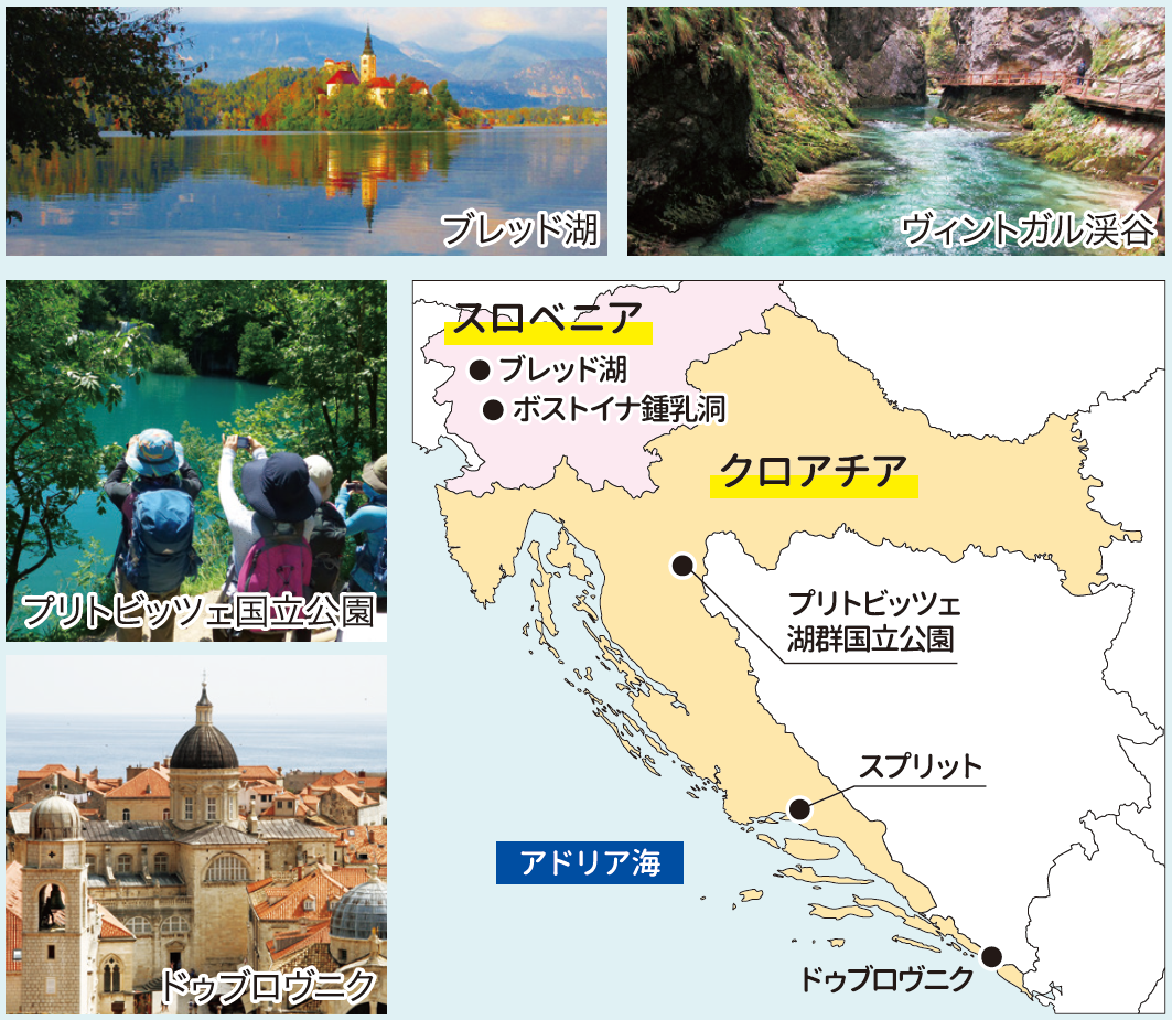 スロベニアやクロアチアには今でも手付かずの美しい自然や、歴史的建造物を多く見る事ができます。スロベニアでは、美しいユリアンアルプスを展望するハイキングやブレッド湖の観光を楽しみます。また、クロアチアでは美しい湖と滝が織りなす、世界遺産·プリトビッツェ国立公園をハイキング。旅の締めくくりは「アドリア海の真珠」といわれるドゥブロヴニクで世界遺産の旧市街を散策します。スロベニアとクロアチアの自然と文化を満喫するツアーです。